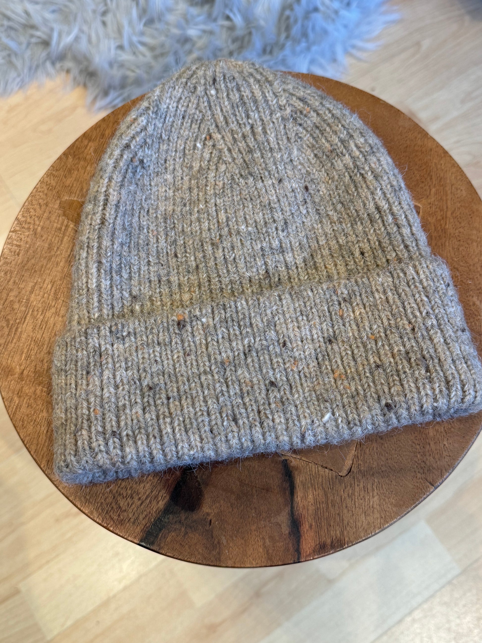 This classic beanie is ribbed in a sophisticated speckled beige. The only beanie you need this winter.