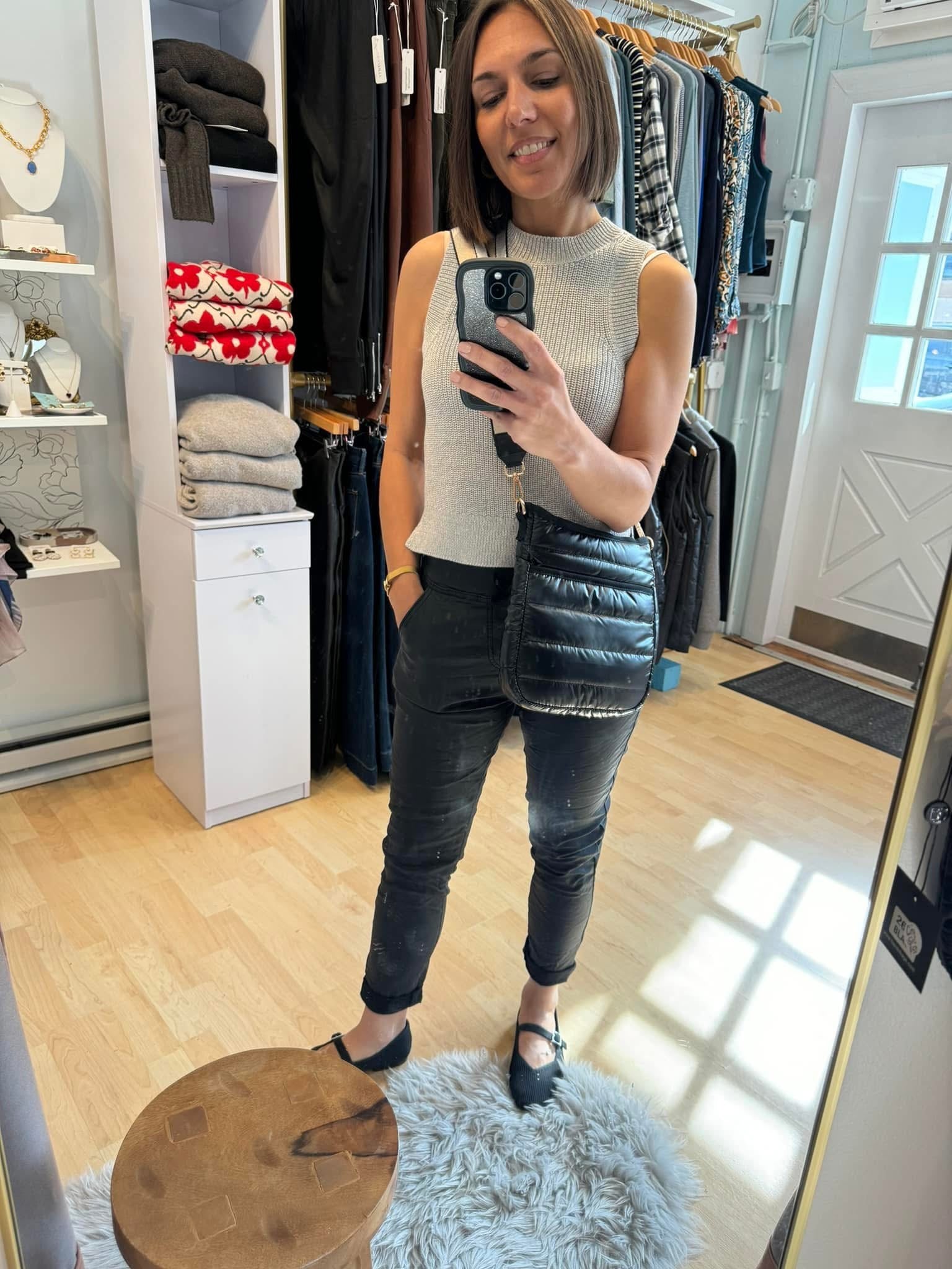 Coated Crinkled Skinny Joggers add a bold touch of style to your wardrobe. With their chic and slightly edgy vibe, these joggers effortlessly elevate any t-shirt for a cool, laid-back look. Pair them with sneakers for a casual feel or booties for a trendier edge.