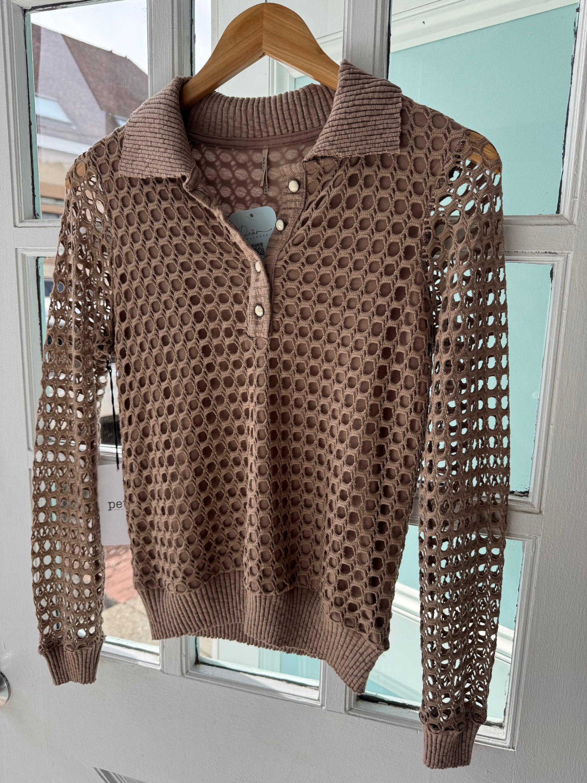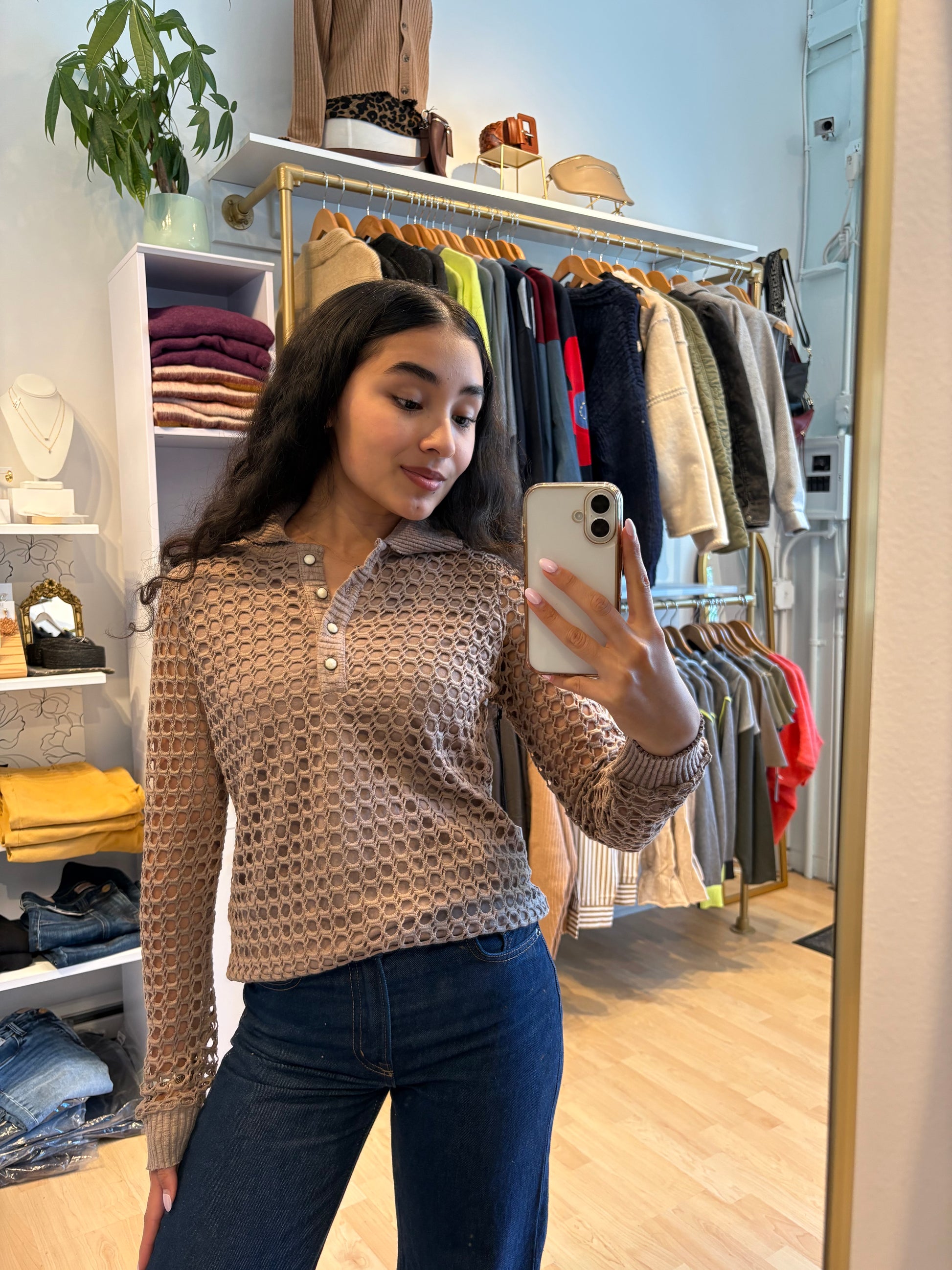 Introducing this unique, fashion-forward crochet polo top - the perfect standout piece for your fall wardrobe. We love how effortlessly it can be dressed up or dressed down. Style it with joggers and a sneaker or dressy pants and boots for a night out.