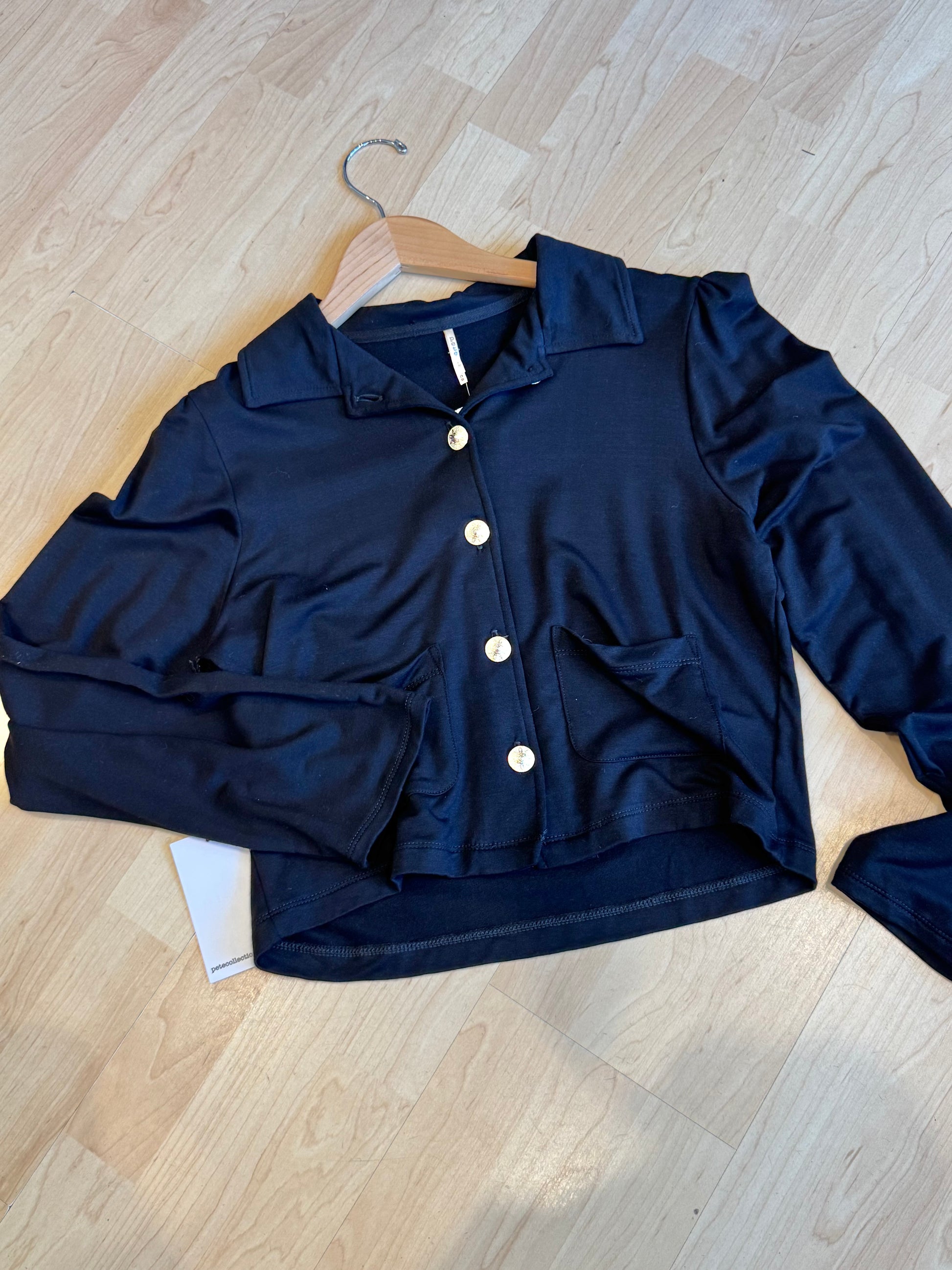 A fashion forward jacket/blouse hybrid, our Dress Up Jacket is the perfect piece to add to your evening and occasion wardrobe. Gold buttons dress up this classic silhouette; front patch pockets; subtle cinching at the shoulder for a slight puff effect.