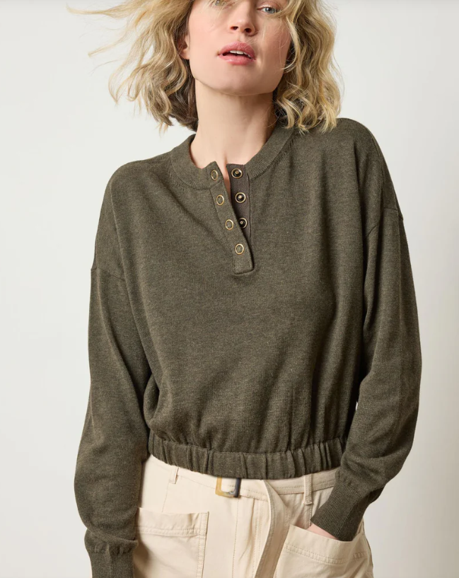 The Elastic Waist Henley Sweater in our Cotton Modal yarn, a soft blend with just the right amount of drape, is effortless and easy-to-wear. Designed with a shorter body length, it pairs perfectly with higher-waist bottoms for a balanced look. Dropped shoulders create a relaxed fit, while the Henley neckline with snap closure adds a casual, laid-back touch.
