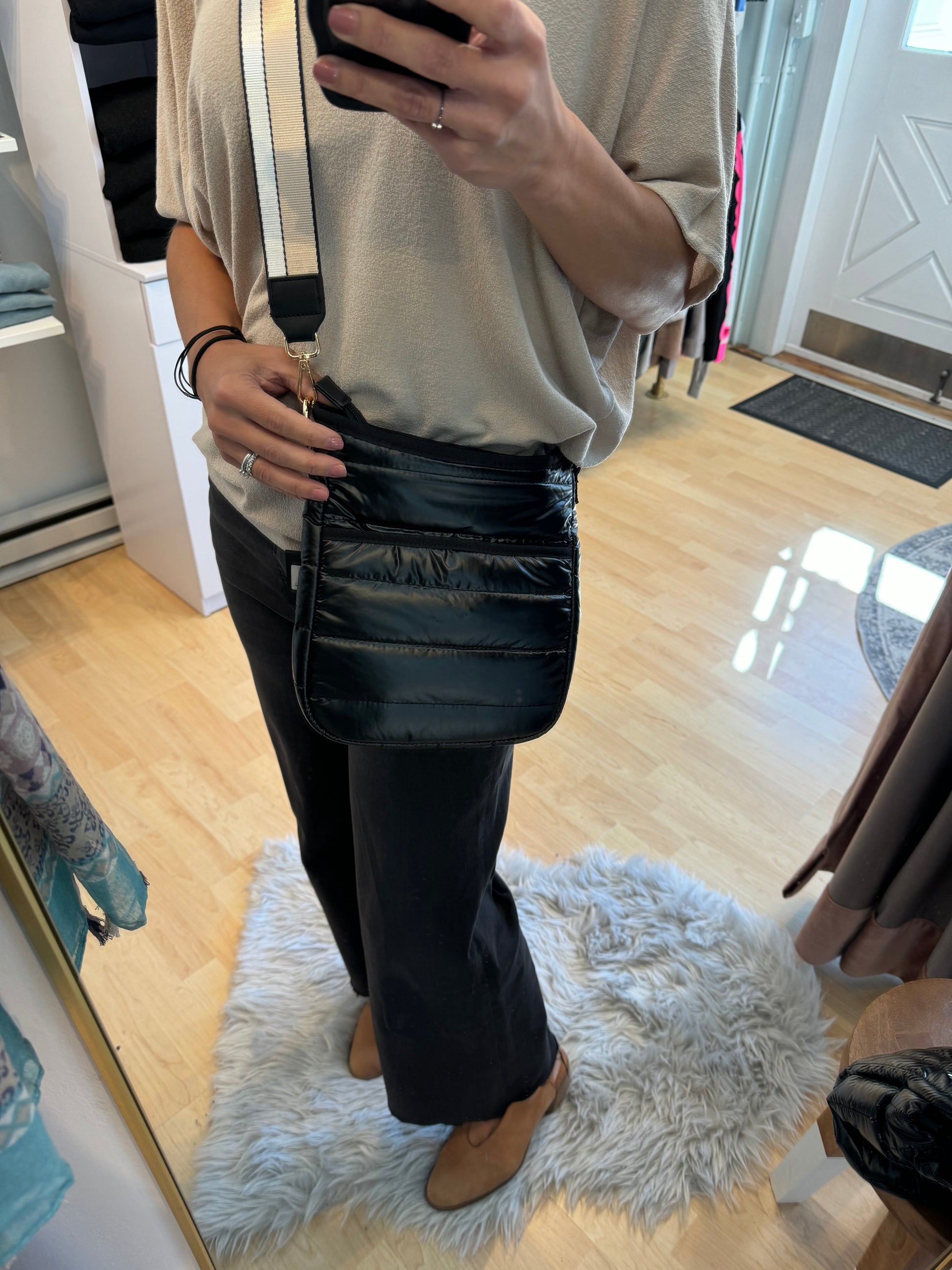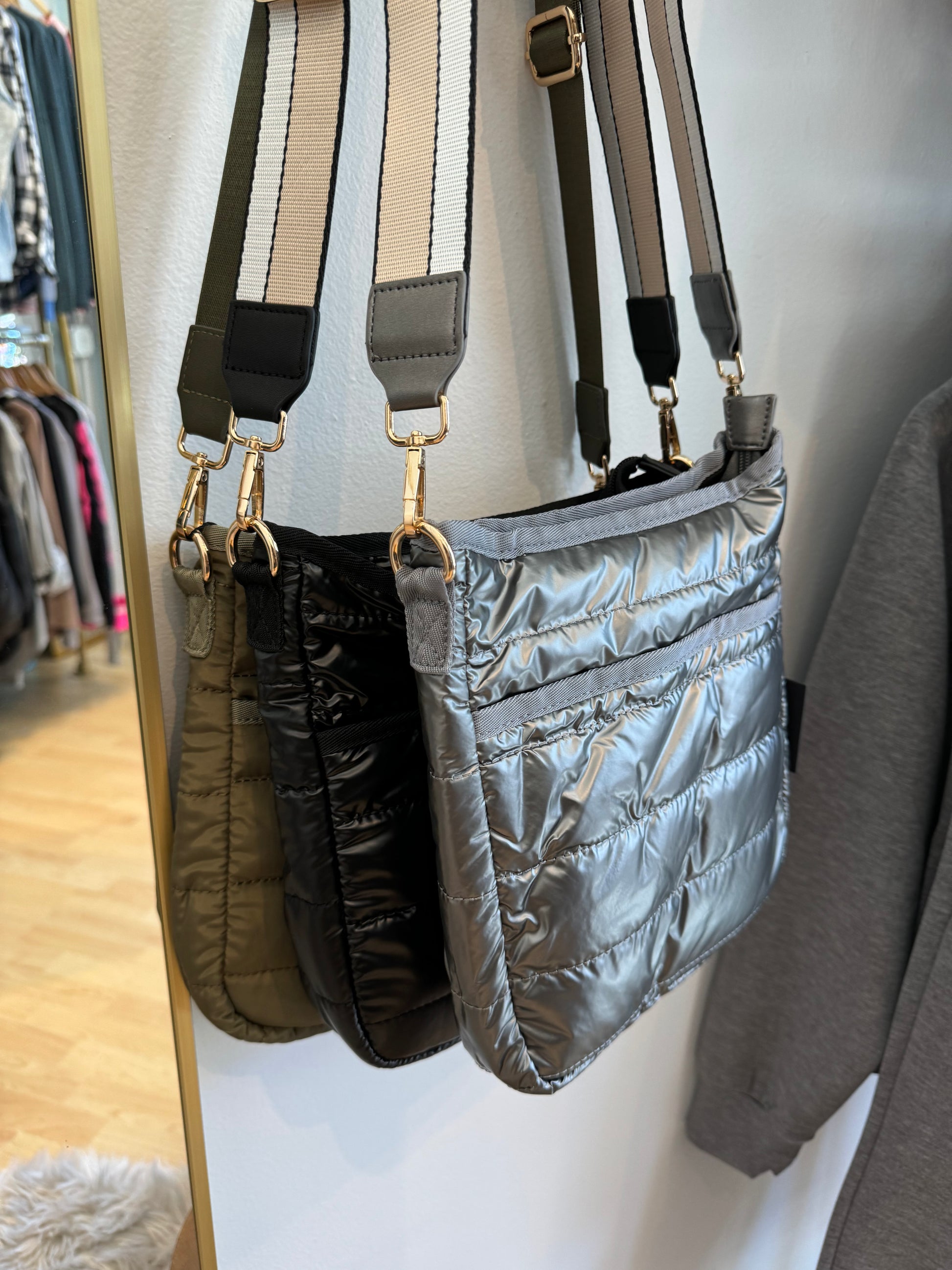 Stay organized and trendy in this perfect pint-sized messenger bag. Featured in a dreamy soft nylon, this crossbody bag features multiple pockets, a cellphone holder and two straps (one gold striped and one solid). This crossbody bag is perfect for travel, weekend outings, and running errands.