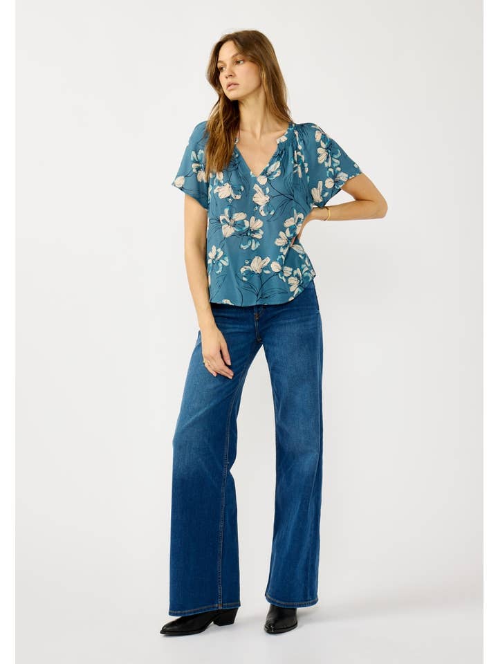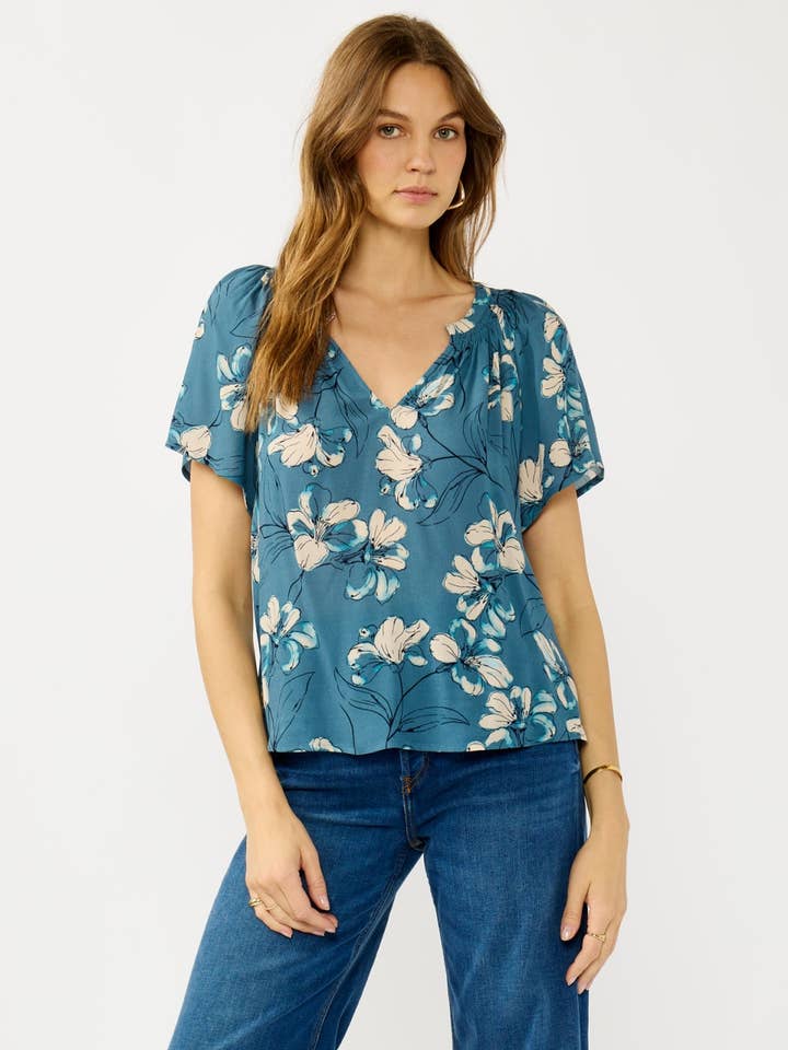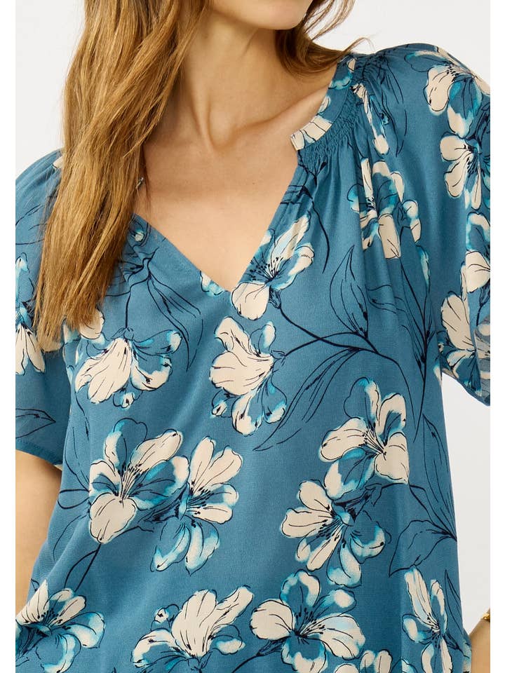 Designed for fall in a rich teal floral print, this short sleeve top is made from airy rayon voile crepe with a soft drape and breathable feel. It features a clean finished neck band with a split neckline, delicate shirring around the front and back for subtle volume, and short sleeves with a relaxed fit. The bodice flows effortlessly into a clean finished hem, offering comfort and movement with a feminine touch.