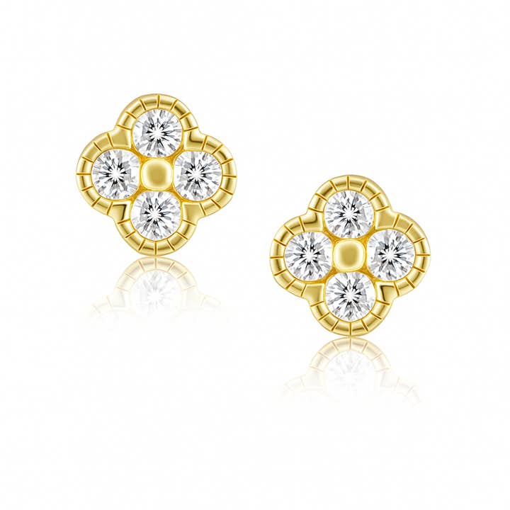 These Gracie CZ Clover Studs combine delicate design with sparkling cubic zirconia stones for a timeless look. Perfect for everyday wear, they add a subtle touch of charm and elegance that complements any outfit with grace. * 18k gold plated over sterling silver * 0.8" * Cz stones * Hypoallergenic * Water & tarnish resistant