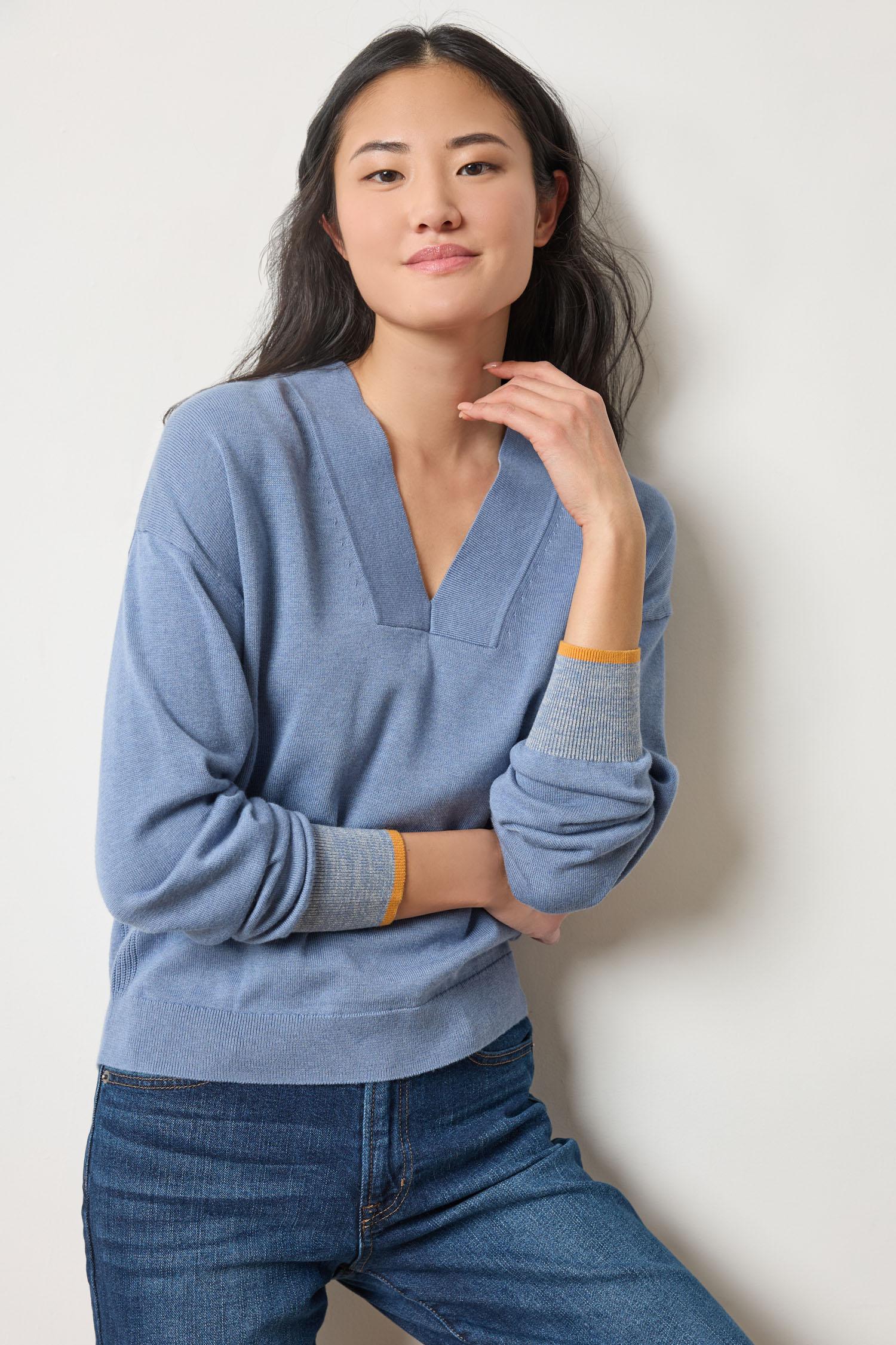 The V-Neck Pullover Sweater in our Cotton Modal blend yarn is a refined take on an effortless staple. Marled cuffs and contrast tipping at the sleeve openings add subtle detail, while the wide trim squared-off V-neckline brings a modern touch. Designed with dropped shoulders and a loose bottom opening, this style is relaxed yet polished, perfect for everyday wear.