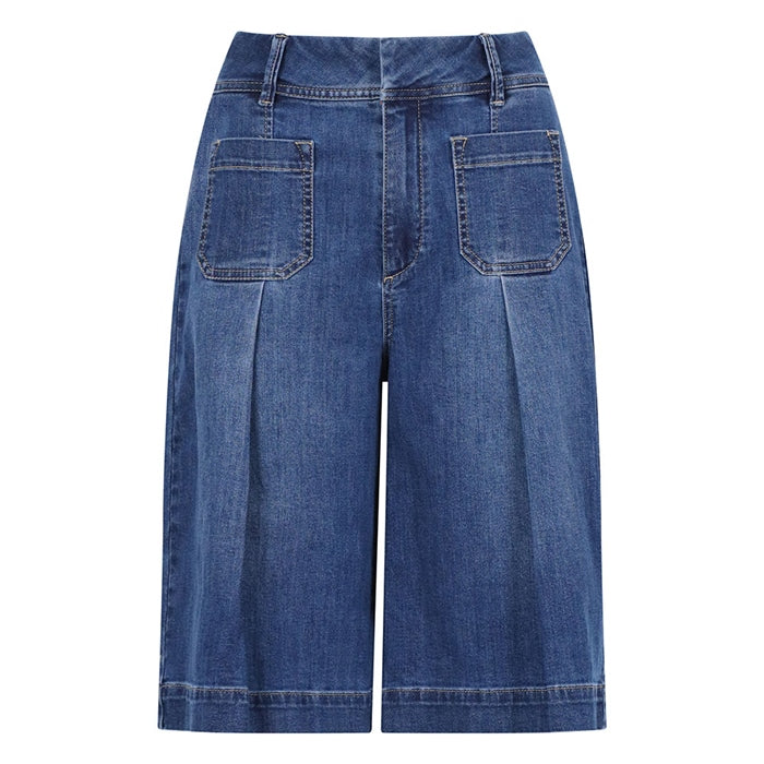 The "Modena" denim city shorts by One Collective blend modern style with feminine flair—perfect for the warmer months. Crafted from soft, stretch cotton denim, they offer a comfortable fit and a flattering silhouette. Designed with a high waist, they’re fitted through the hips and gently flare into a subtle A-line shape, finishing just above the knee. Front pleats add a tailored touch, flowing from beneath the two front patch pockets, while two faux back pockets maintain a sleek finish. Complete with a hook-and-eye and zip fastening, these versatile shorts are a chic staple for your Spring/Summer wardrobe—effortlessly paired with your favourite tees or blouses.