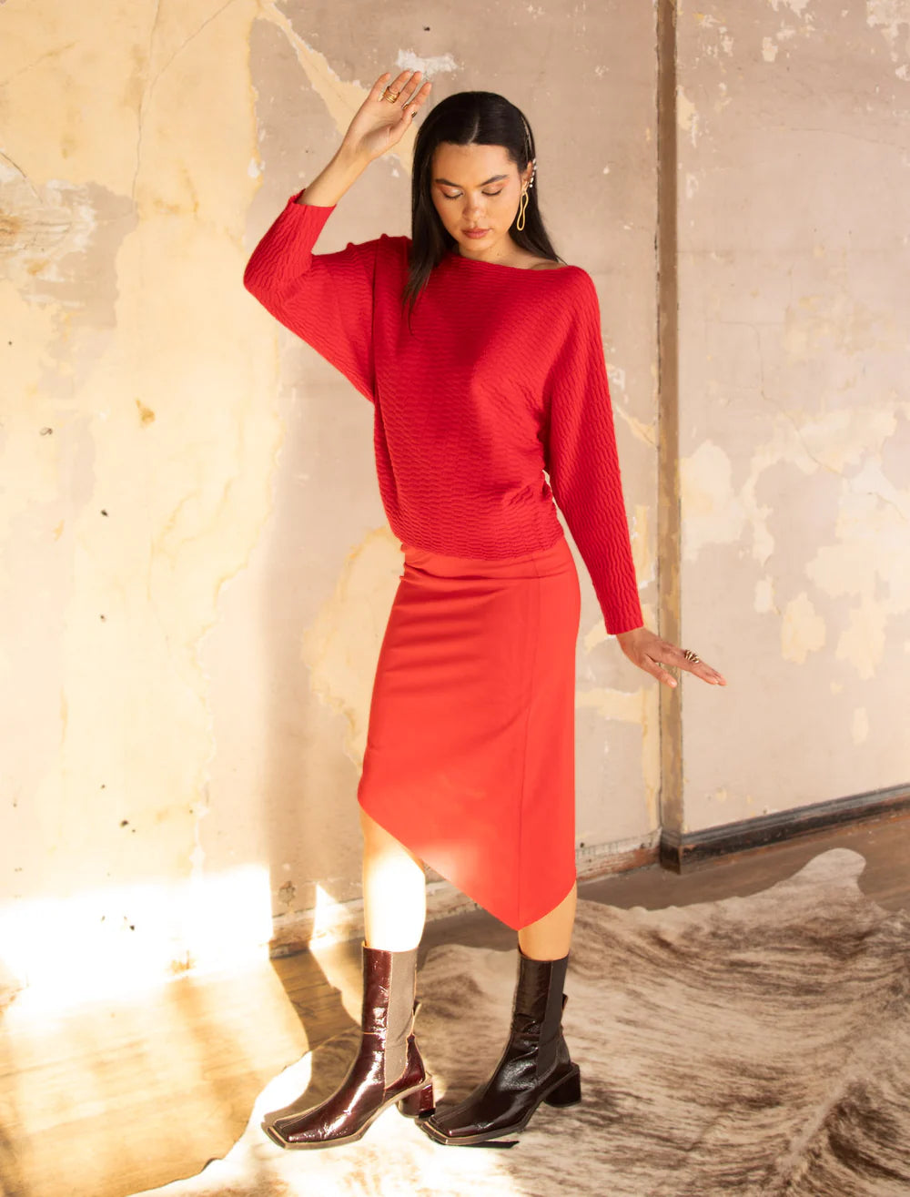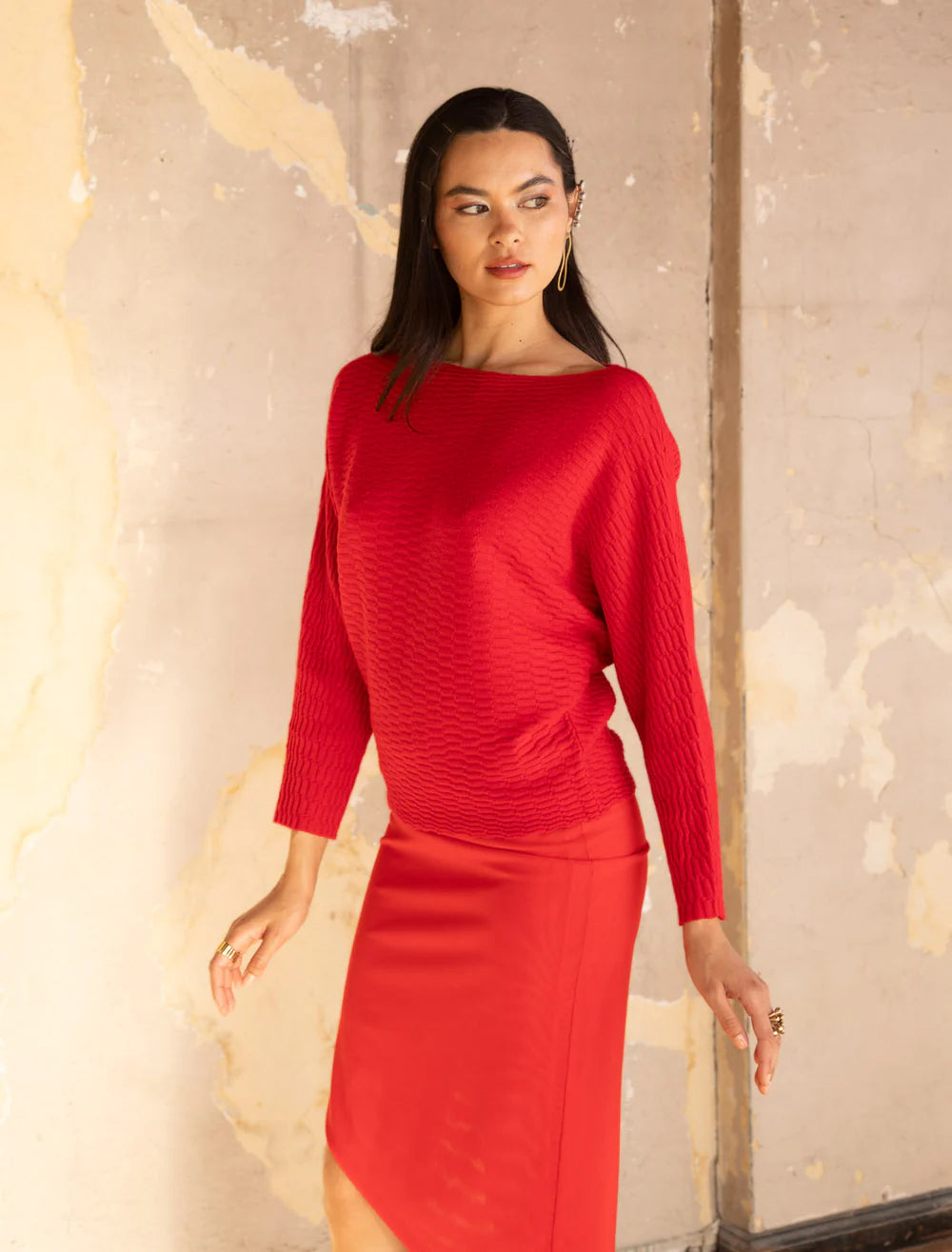 You’ll make an “impression” when wearing this elegantly patterned sweater. Its romantic boatneck and dolman sleeves will charmingly frame your torso. This design is an effortless counterpart to our beloved Ryu series.