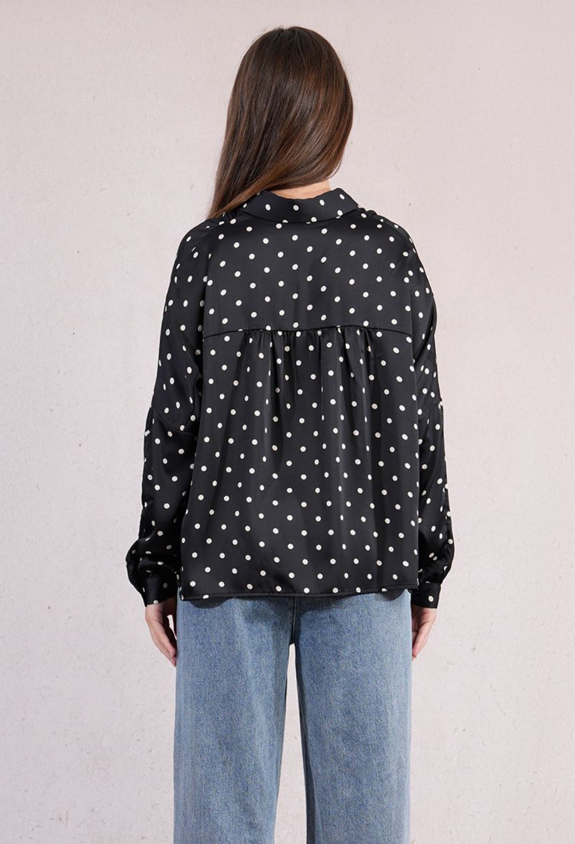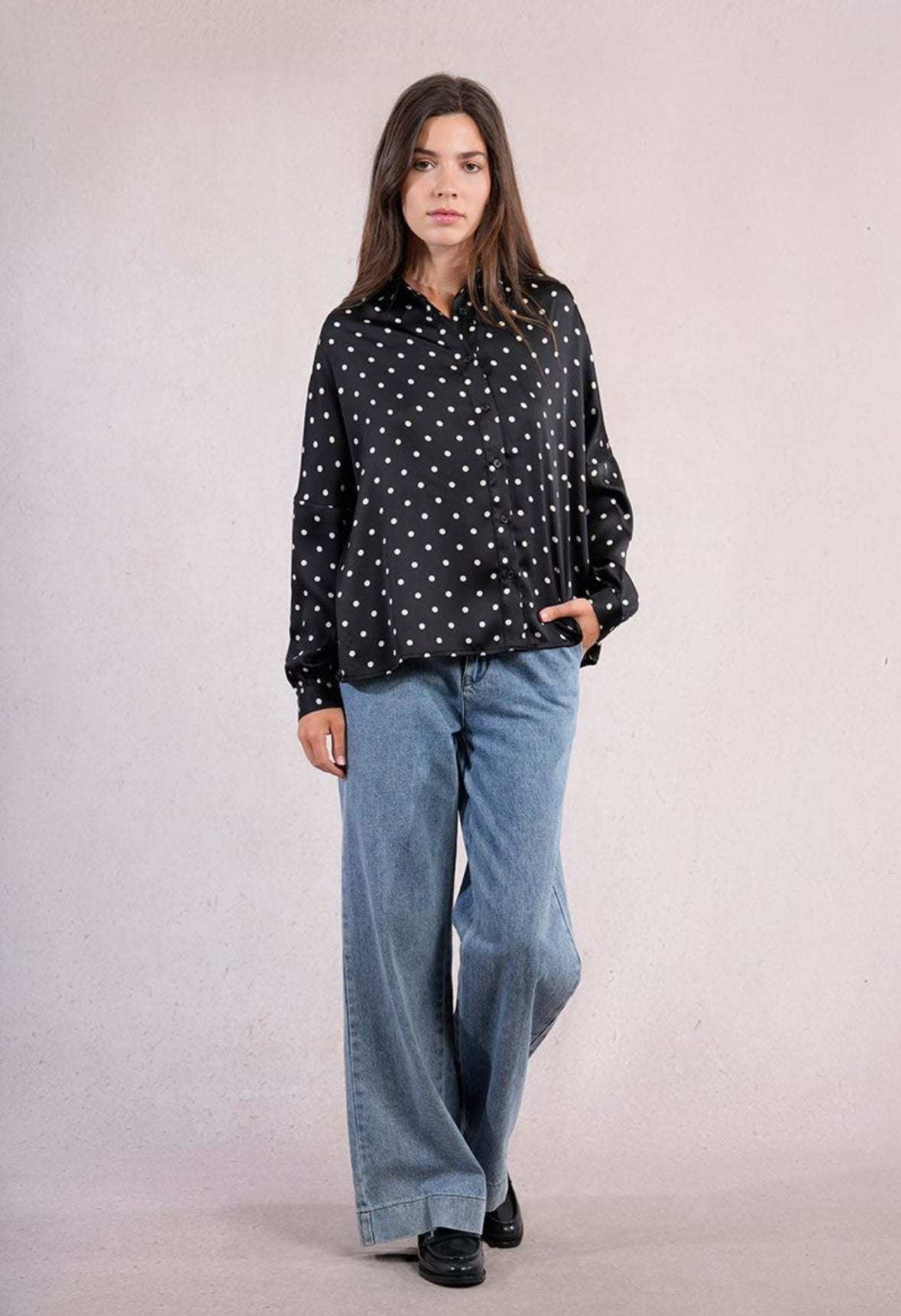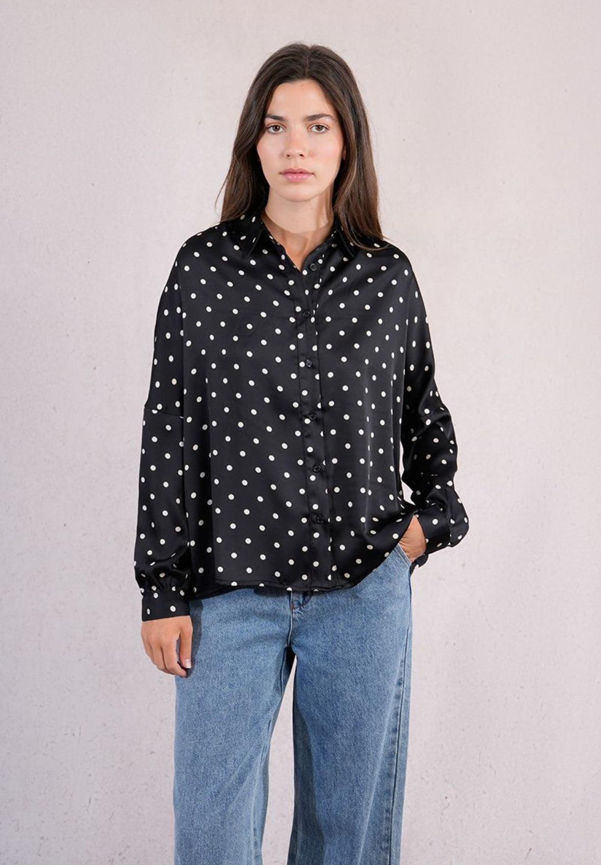 Bring a touch of playful sophistication to your wardrobe with this silky smooth polka dot button down blouse. Designed in an easy relaxed fit, it offers effortless comfort. Perfect for adding a modern twist to your business casual style.