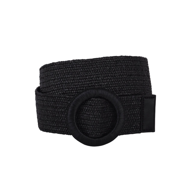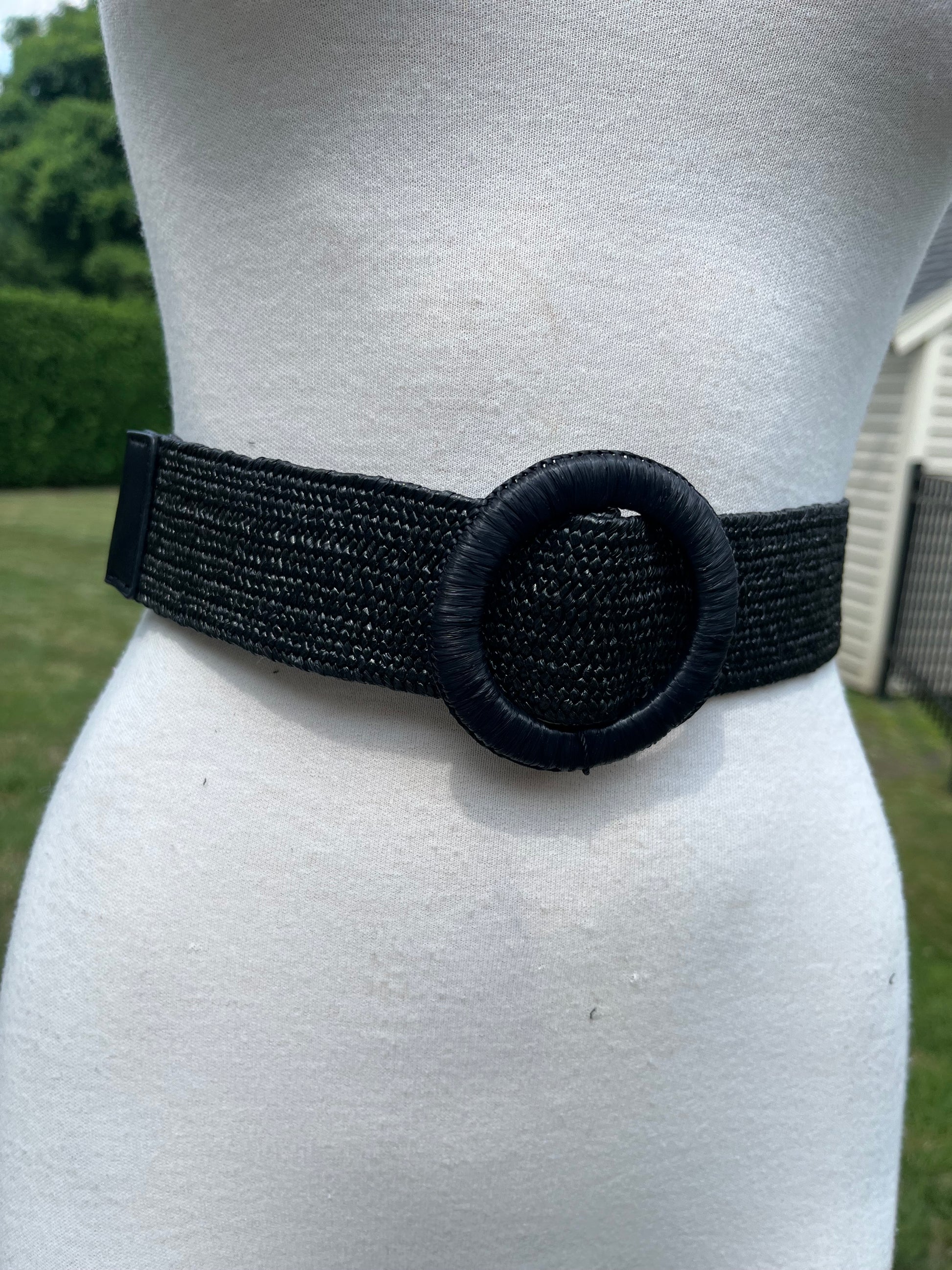 Infuse your look with boho charm using this woven raffia circle buckle stretch waist belt, featuring a chic circular buckle crafted from natural raffia fibers. Its stretch design ensures a comfortable fit while adding a touch of bohemian flair to dresses, skirts, or high-waisted pants. Material: raffia Weight: ~3 oz Width: 1.9" Length: SM: 34.5" ML: 37.5"
