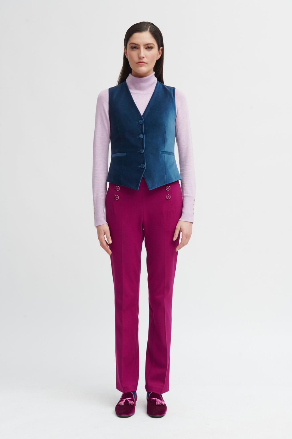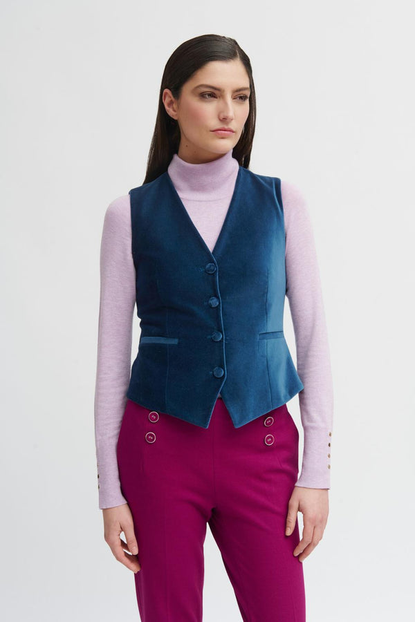 Fitted velvet vest. Inner lining. V-neckline and sleeveless sleeves. Front button closure. False welt pockets on the front.