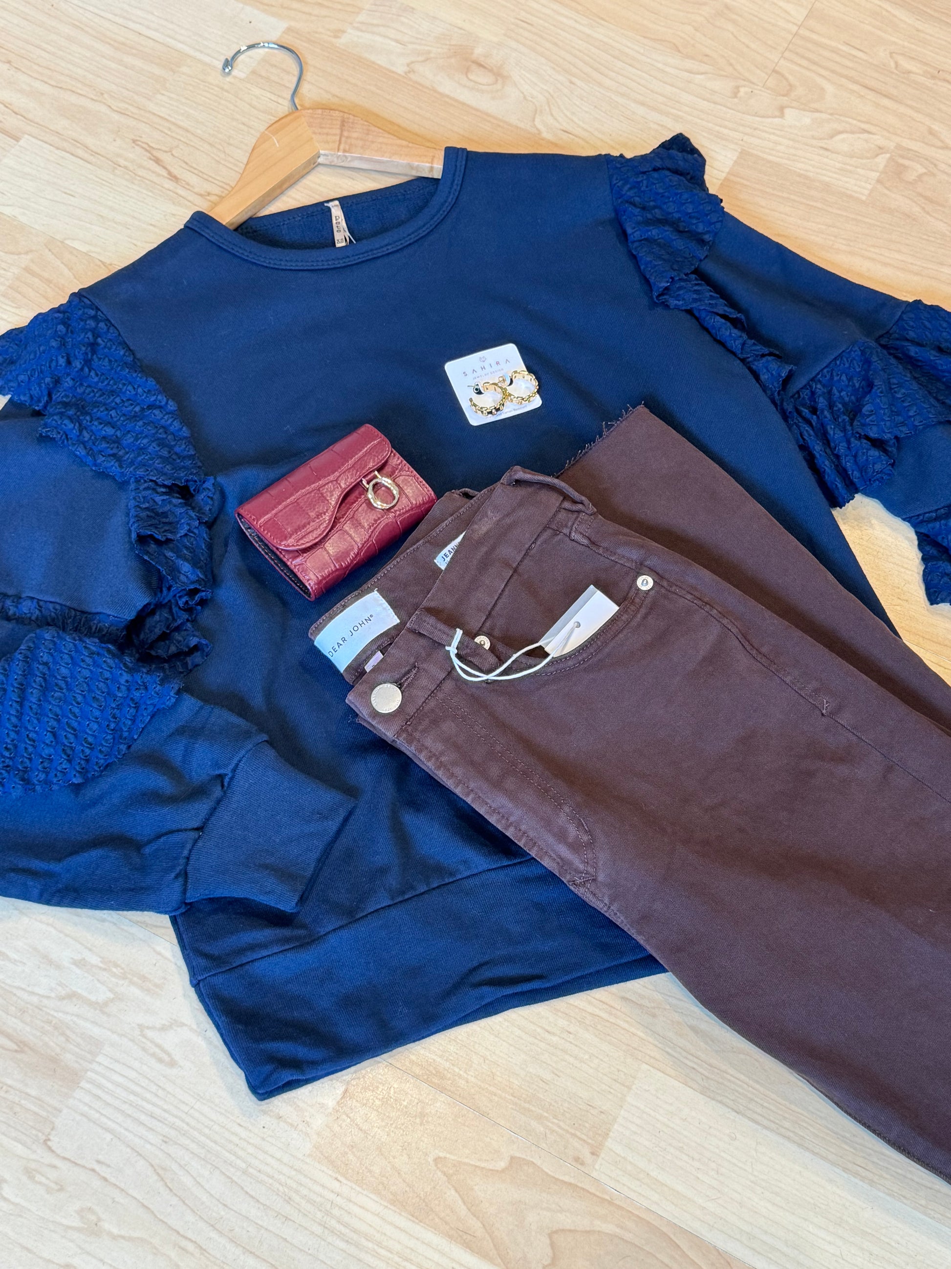 Add a twist to your basic wardrobe with this ruffle sleeve sweatshirt! We love it paired with a classic wash denim, or dress it up with faux leather or coated denim for an unexpected nighttime look. Cotton and poly.