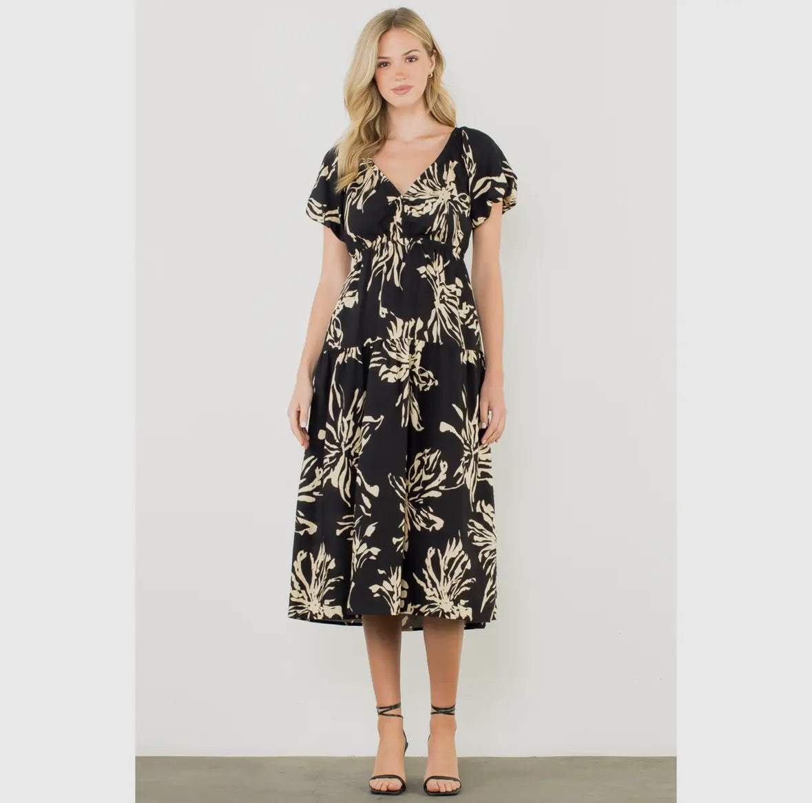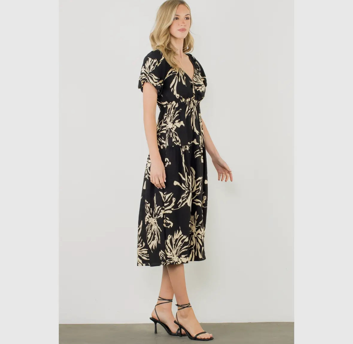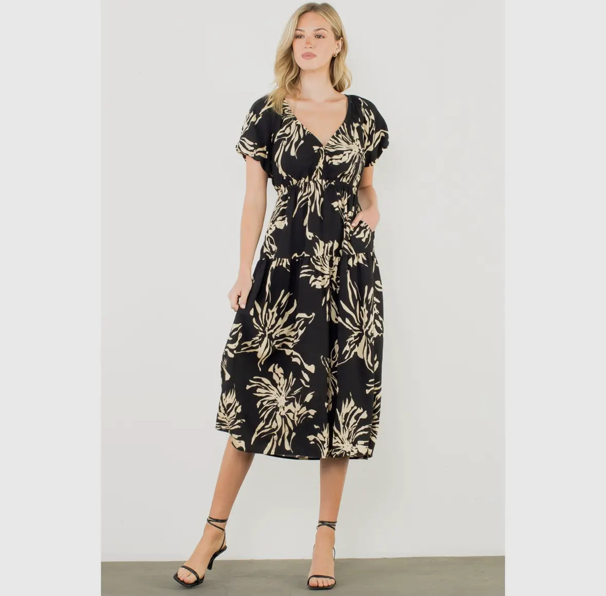 Step into elegance with this puff sleeve printed maxi dress. Features pockets, V-neck, short puffed sleeves and a tasteful, modern print. Versatile enough to wear to work or out to dinner. Its flowy skirt will have you doing twirls!