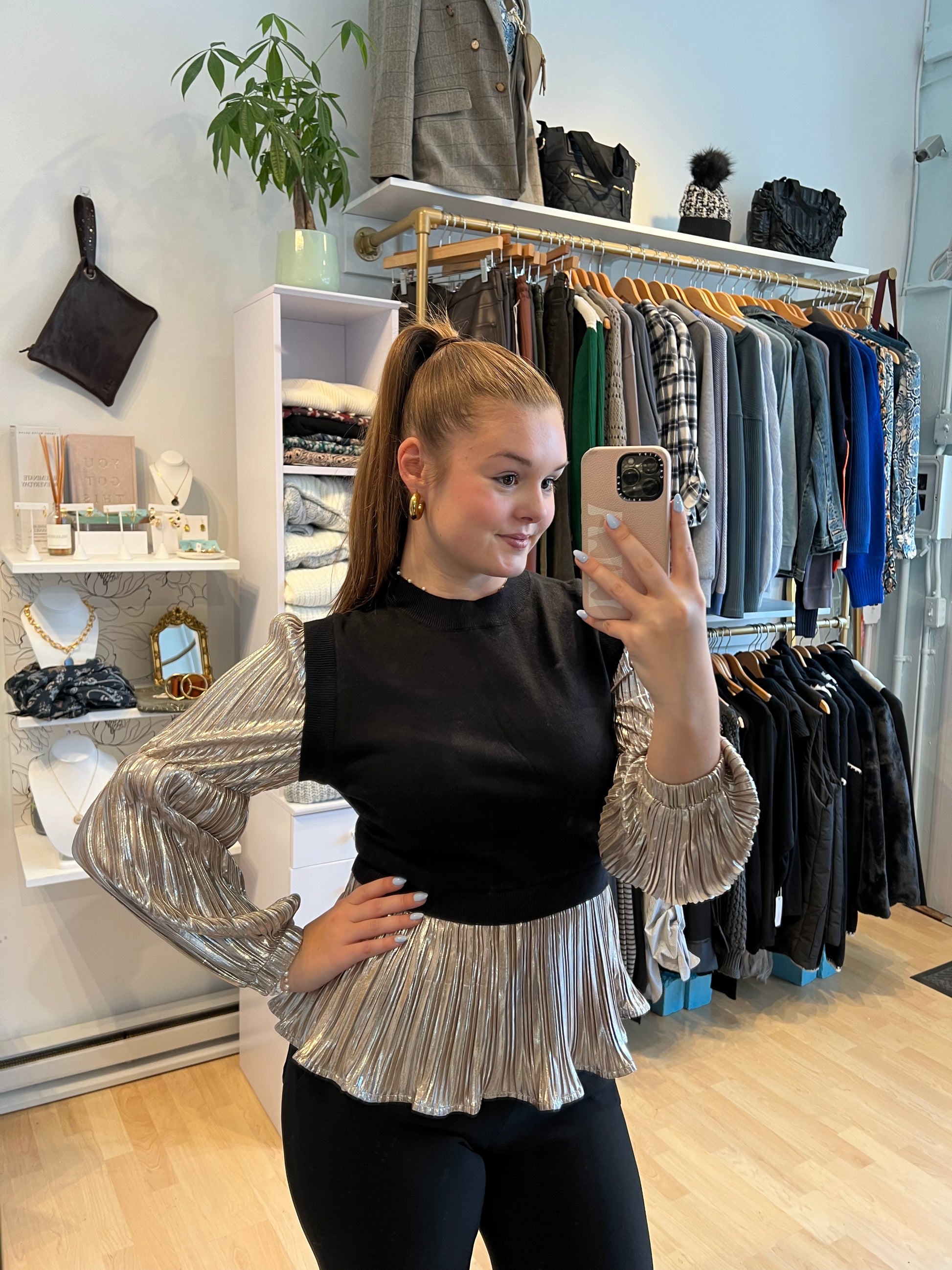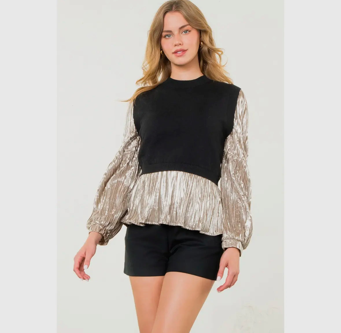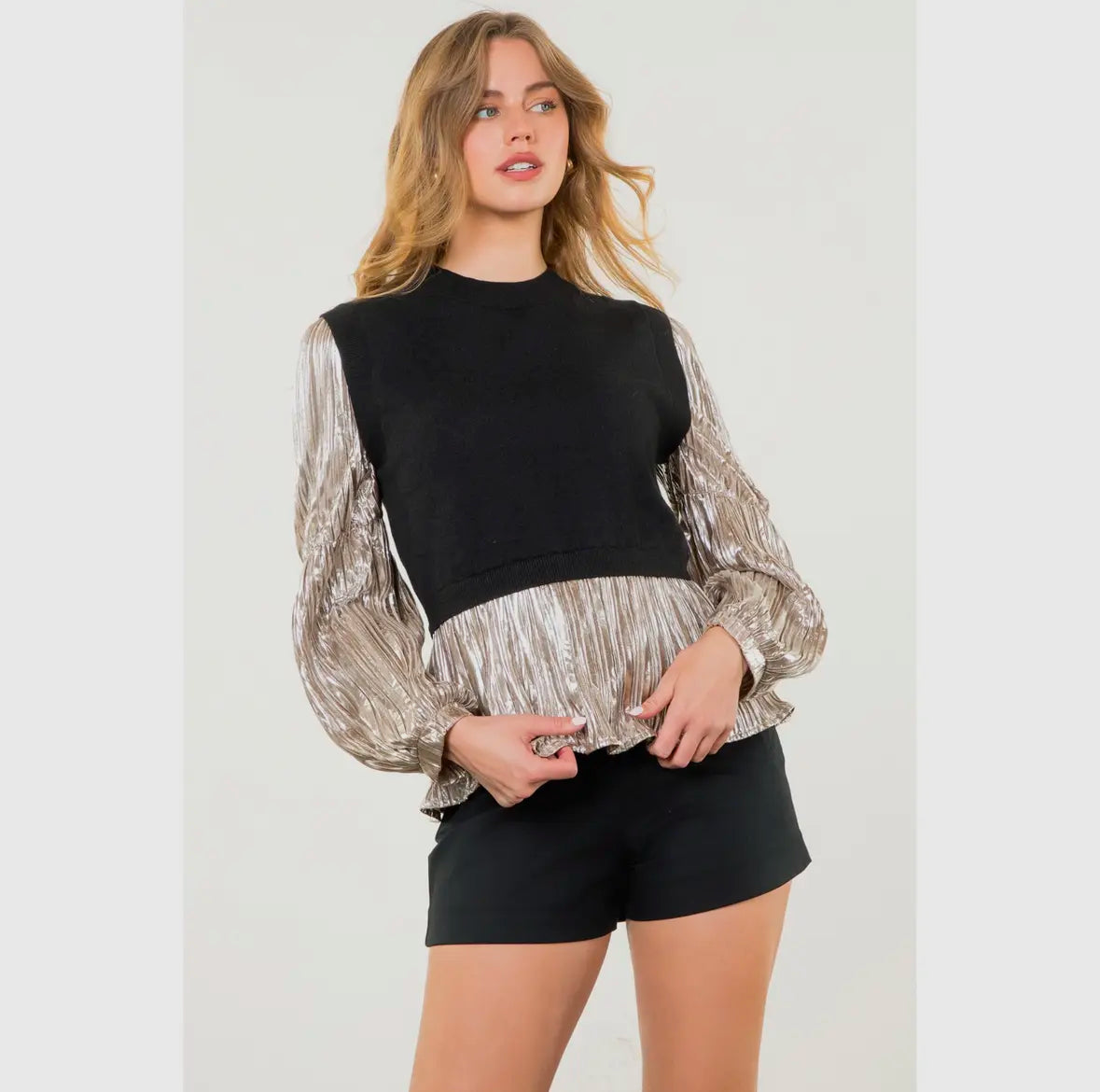 The perfect top for any holiday event you are attending this season! This knit top has metallic sleeves that will be sure to turn heads.