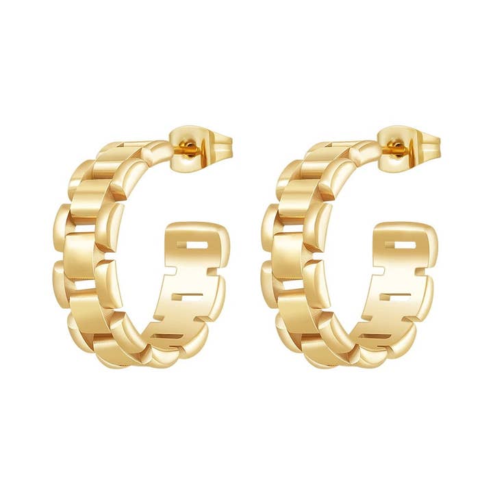 Upgrade your watch game with our Watch Link Hoop. Featuring a stylish watch link design, this accessory brings both form and function to your wrist. Elevate your style and keep track of time with ease. Perfect for everyday wear or special occasions. * 18k Gold Plated over Stainless Steel * Hypoallergenic * Water & Tarnish Resistant